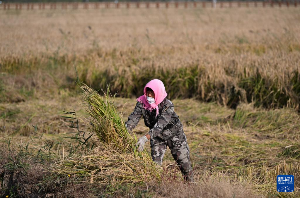 10月23日,村民在天津市津南区小站镇会馆村收割水稻。