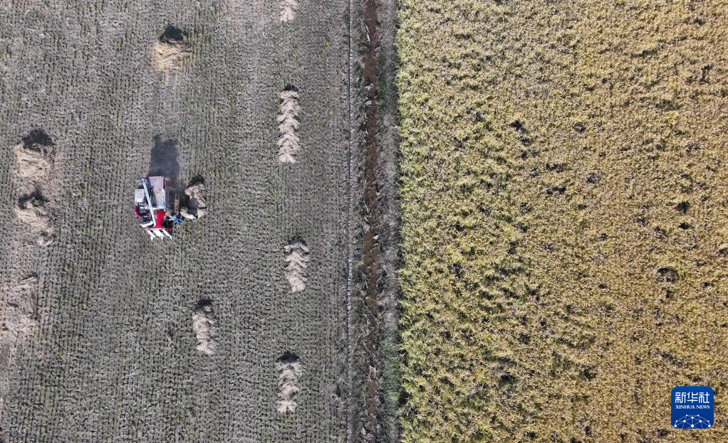 10月23日,收割机在小站稻会馆村种植核心区作业(无人机照片)。
