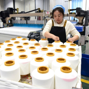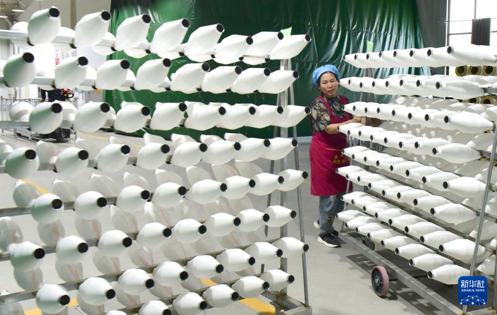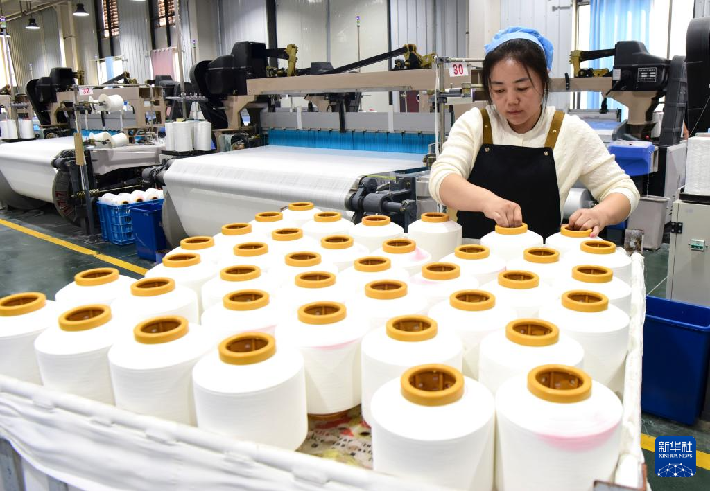 10月23日,工人在河南省上蔡县一家纺织企业生产线工作。