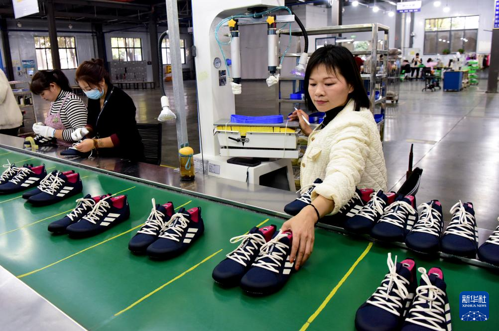10月23日,工人在河南省上蔡县一家制鞋企业生产线工作。