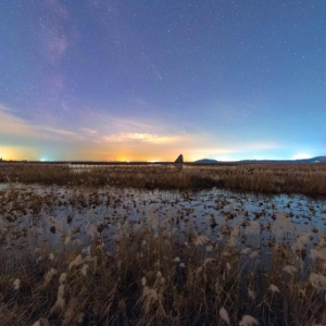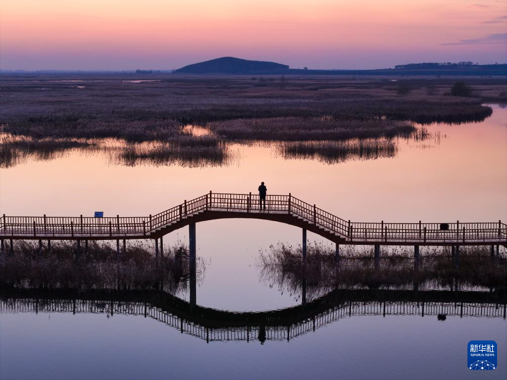 深秋时节,晚霞与星空掩映下的黑龙江省佳木斯市富锦国家湿地公园恬静如画。