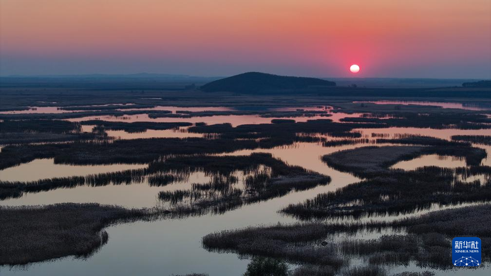 10月24日在黑龙江省佳木斯市富锦国家湿地公园拍摄的晚霞(无人机照片)。