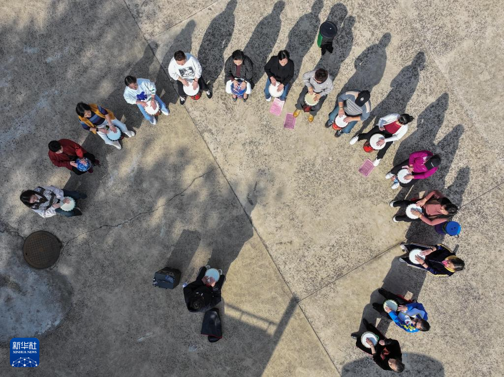 10月25日,在湘潭市雨湖区广场街道建设社区,学员在非洲鼓课上练习(无人机照片)。