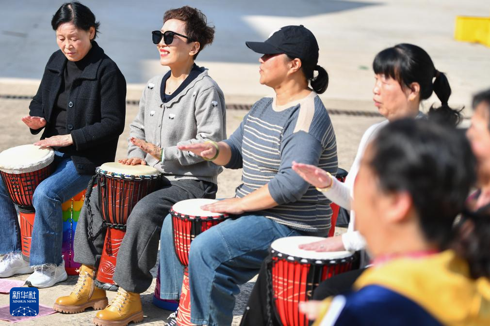 10月25日,在湘潭市雨湖区广场街道建设社区,学员在非洲鼓课上练习。