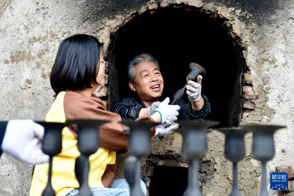在日照黑陶邢艺术厂,非遗传承人邢葆东(右)从窑中取出刚烧制的黑陶(5月26日摄)。