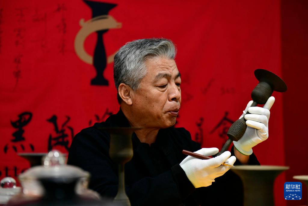 10月22日,在日照黑陶邢艺术厂,非遗传承人邢葆东在制作蛋壳黑陶。蛋壳黑陶高柄杯,最薄处只有0.2毫米左右,有着“黑如漆、亮如镜、薄如纸、声如磬、硬如瓷”的赞誉。