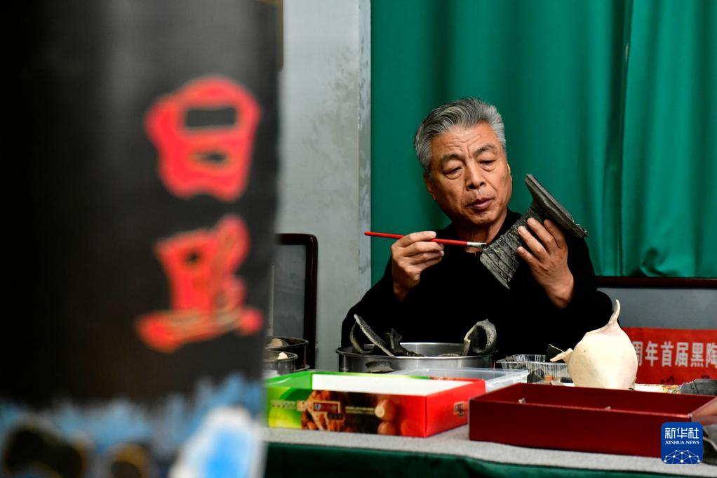 10月22日,在日照黑陶邢艺术厂,非遗传承人邢葆东在打理黑陶残片。