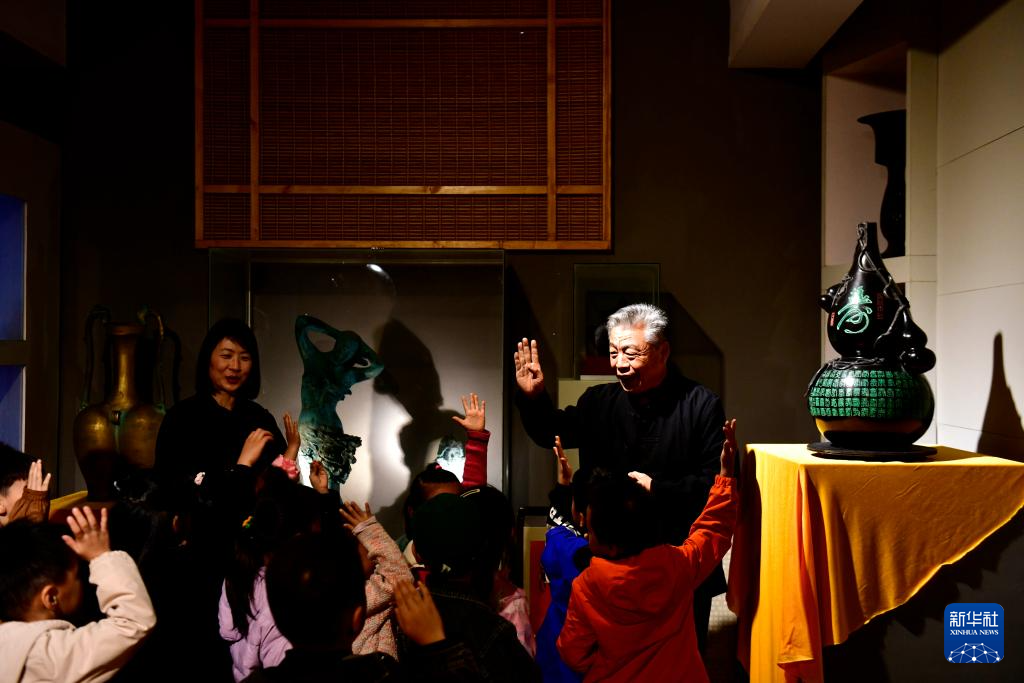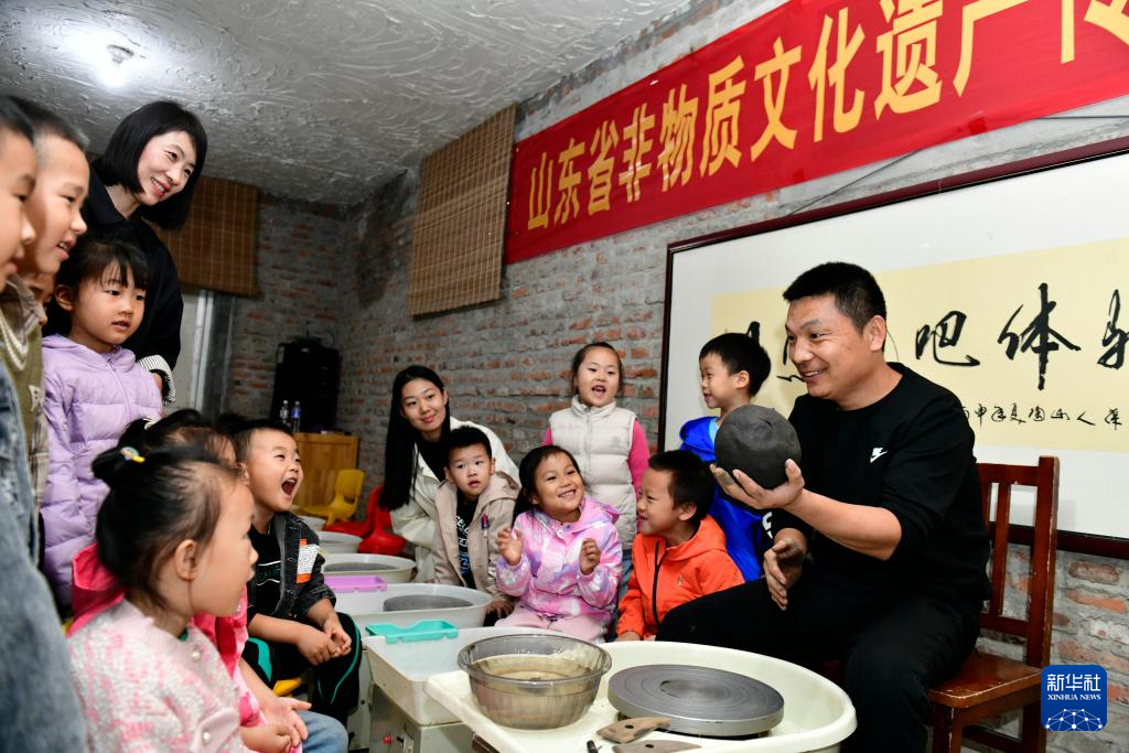 10月22日,在日照黑陶邢艺术厂,非遗传承人邢葆奎向前来研学的老师和小朋友展示黑陶制作技艺。