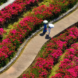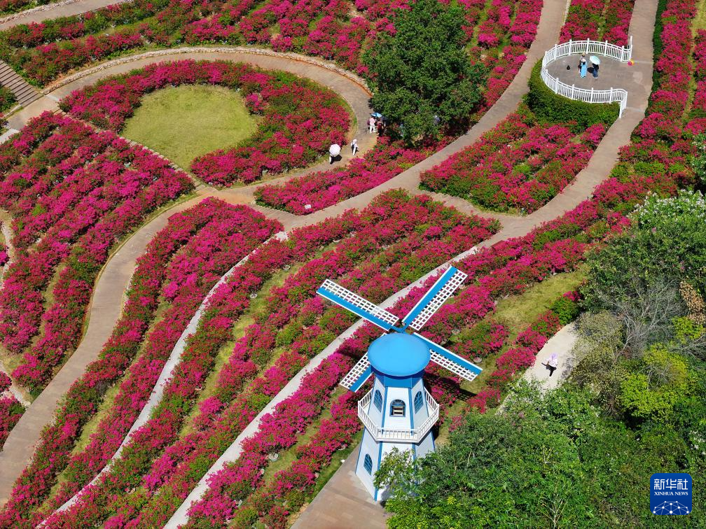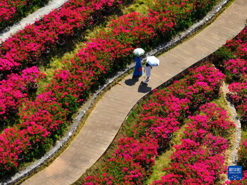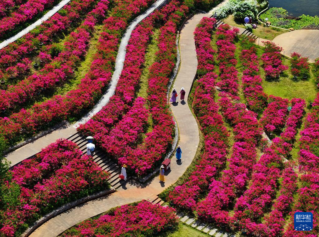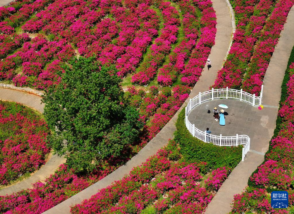 游人在南宁青秀山风景区叶子花园观赏三角梅(10月25日摄,无人机照片)。