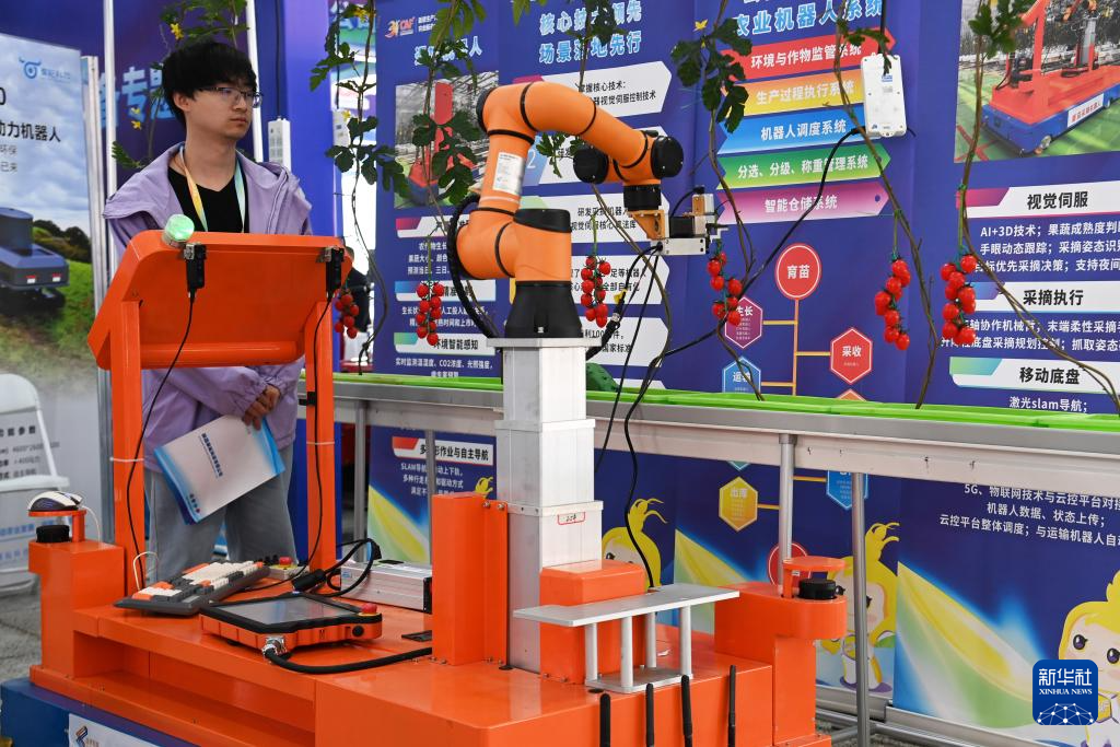 10月25日,工作人员在杨凌农高会展示一台自动采摘机器人。