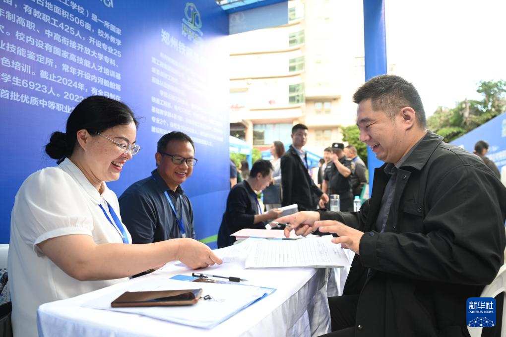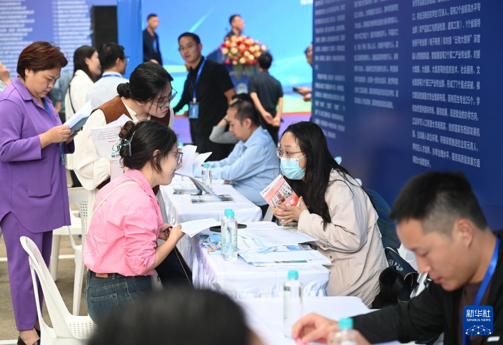 10月25日,福州世纪金源大饭店代表(右)与云南省普洱市职业教育中心工作人员在校企对接招聘活动中达成校企合作意向。