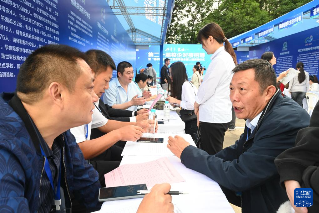 10月25日,福州市长乐区祥泰实业有限公司代表(右)在现场与重庆市万州职业教育中心工作人员在校企对接招聘活动中洽谈校企合作事宜。