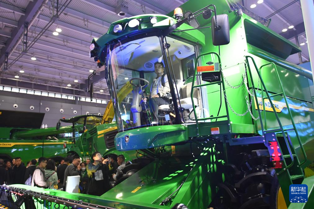 10月26日,观众在2024中国国际农业机械展览会上了解一款收割机。