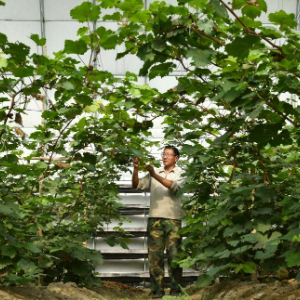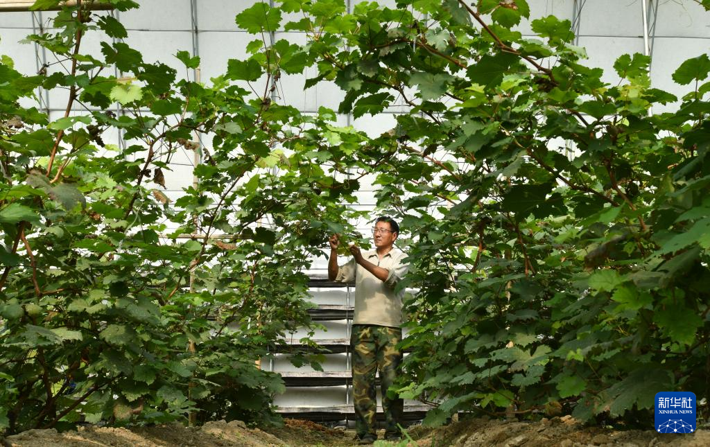 10月25日,河北省河间市沙河桥镇一处家庭农场的经营者在大棚内打理种植的葡萄。