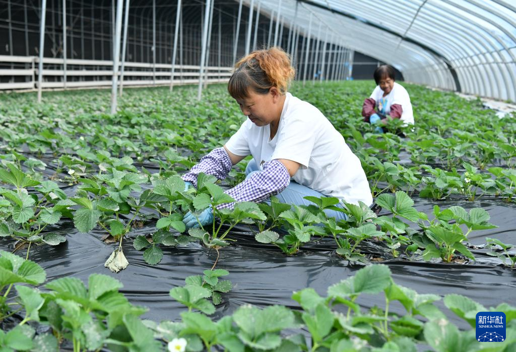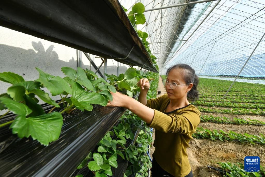 10月25日,河北省河间市沙河桥镇一处家庭农场的经营者在大棚内打理种植的草莓。