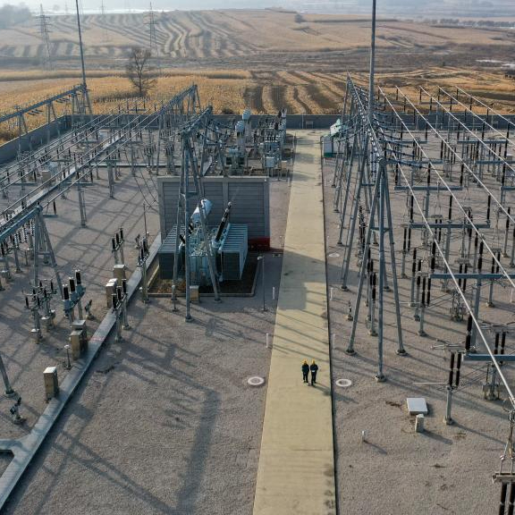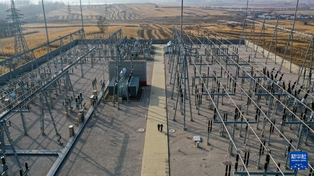 10月24日,在国网吉林供电公司永吉220千伏变电站,电能质量管理员李欣育(右)与同事张天宇检查设备运行情况(无人机照片)。