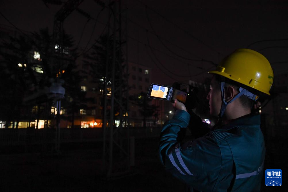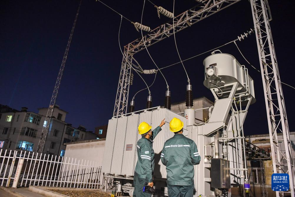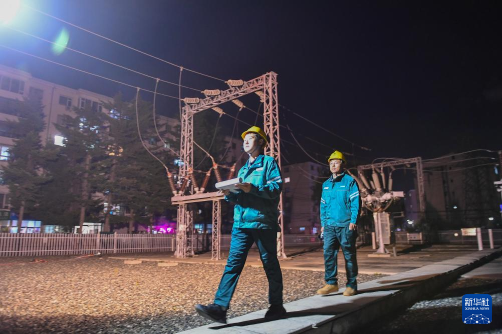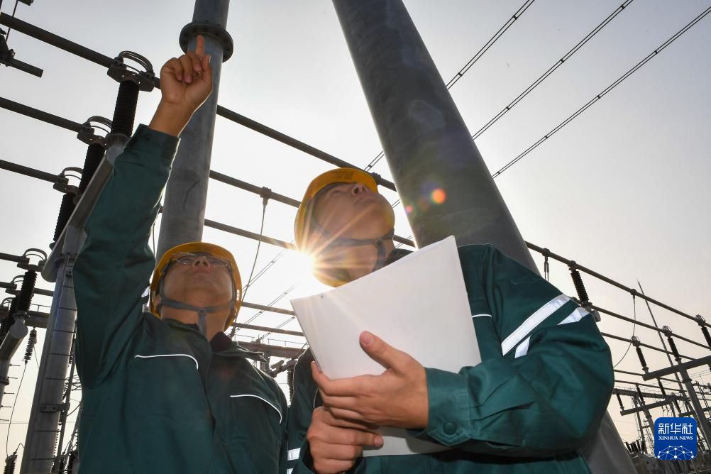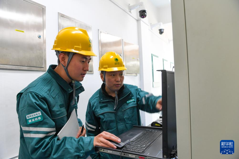 10月24日,在国网吉林供电公司永吉220千伏变电站,电能质量管理员李欣育(右)与同事张天宇检查设备运行情况。