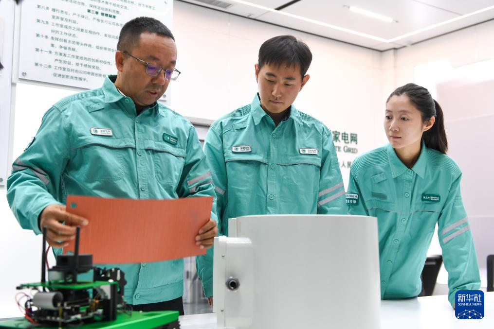 10月24日,在国网吉林供电公司设备运维集控中心,高级技师丁伟(左)向电能质量管理员李欣育(中)、张力丹介绍变电运维工作中的新技术设备。