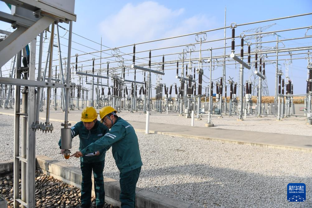 10月24日,在国网吉林供电公司永吉220千伏变电站,电能质量管理员李欣育(左)与同事张天宇检查设备运行情况。
