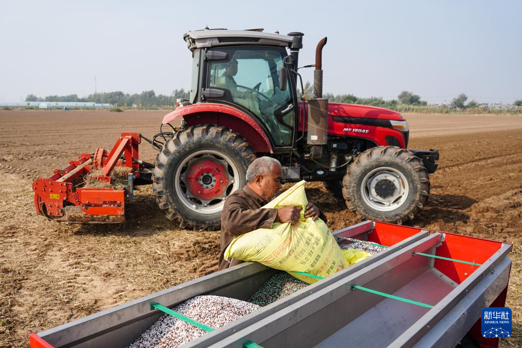 10月25日,在聊城市东昌府区闫寺街道辛王顺丰家庭农场,农机手为播种机添加化肥。