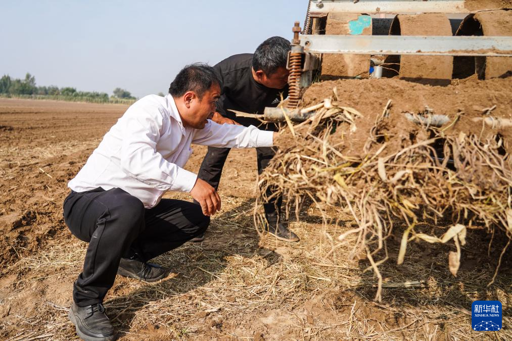 10月25日,在聊城市东昌府区闫寺街道辛王顺丰家庭农场,农场负责人王伟(左)和农机手查看小麦播种机。