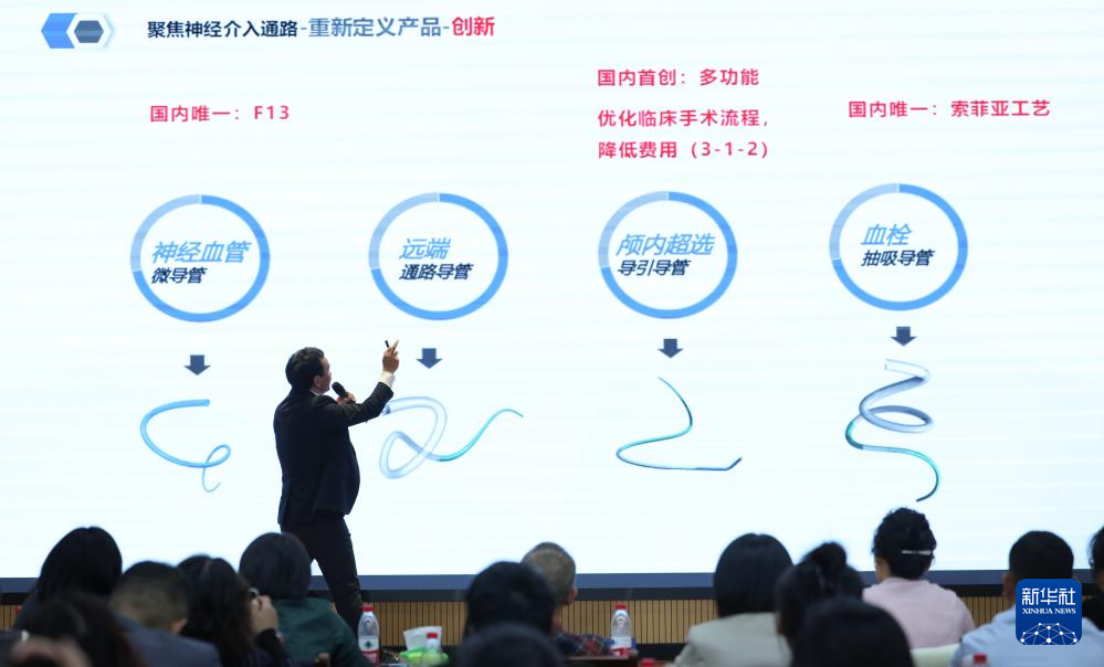 在成长营商业模式创新路演课上,一位学员介绍他的脑血管介入初创企业(10月24日摄)。