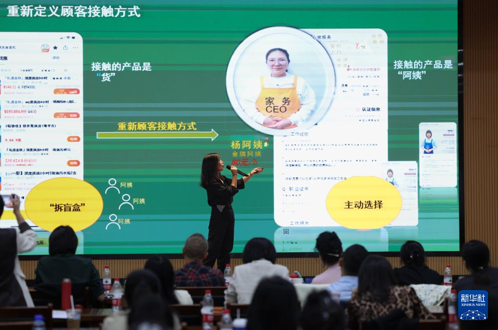 在成长营商业模式创新路演课上,一位学员介绍她的家政企业(10月24日摄)。
