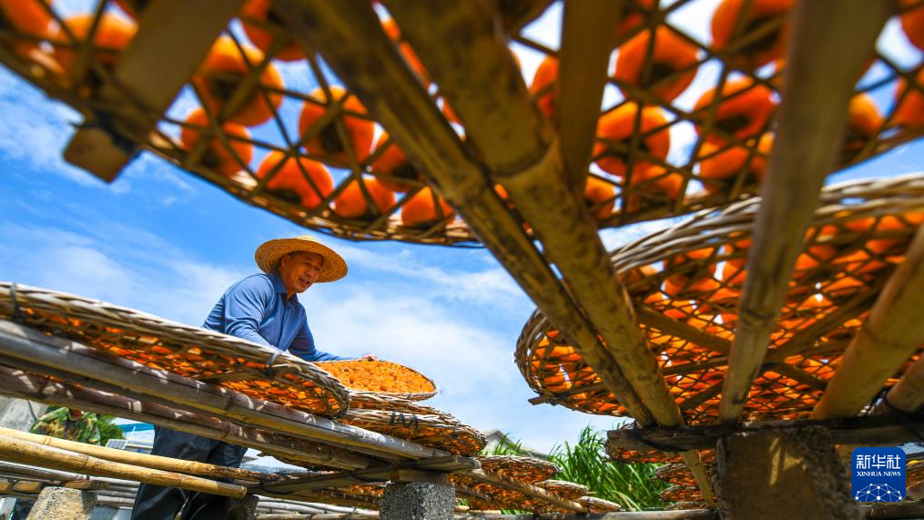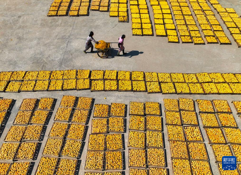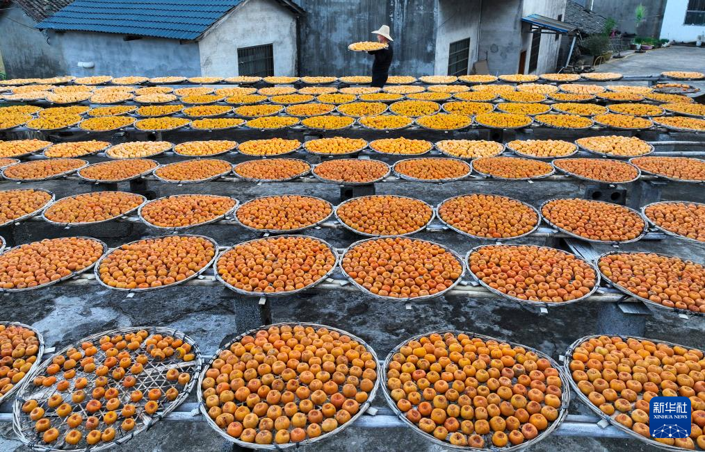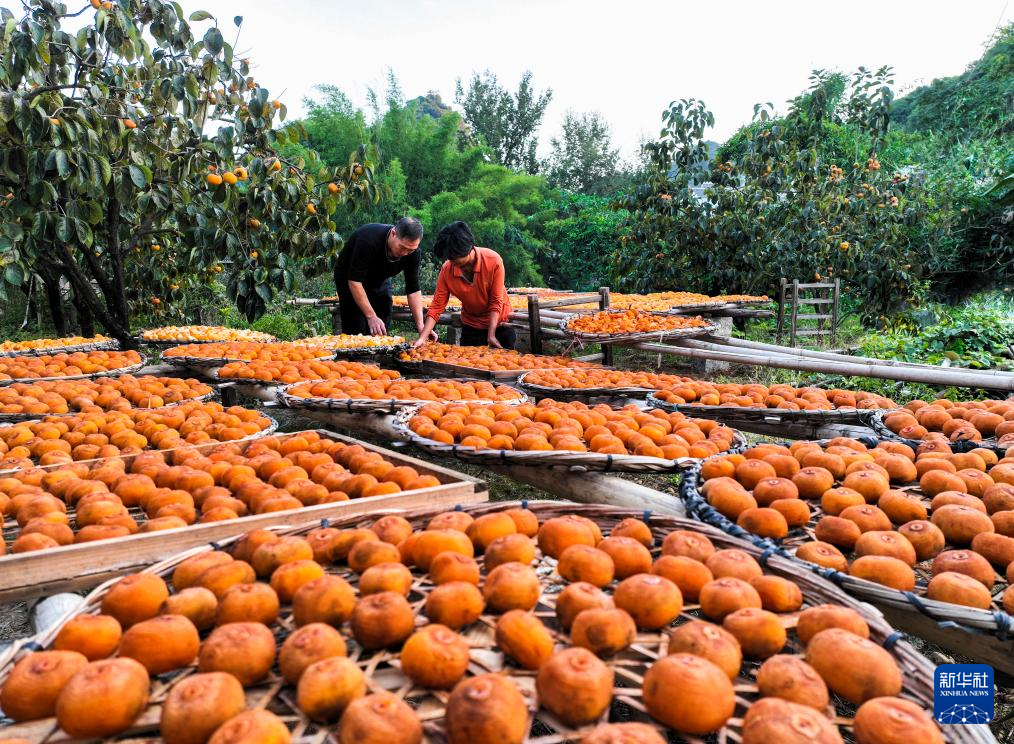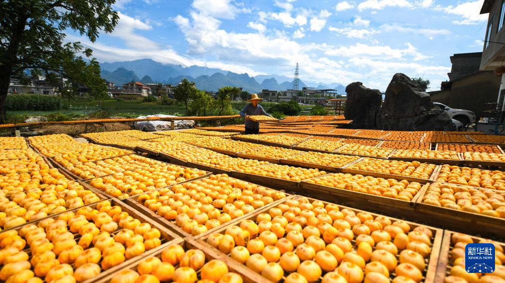 金秋时节,广西桂林市恭城瑶族自治县的月柿迎来收获季。当地柿农趁着晴好天气加紧采摘加工,房前屋后遍地金黄,瑶乡处处一派丰收景象。