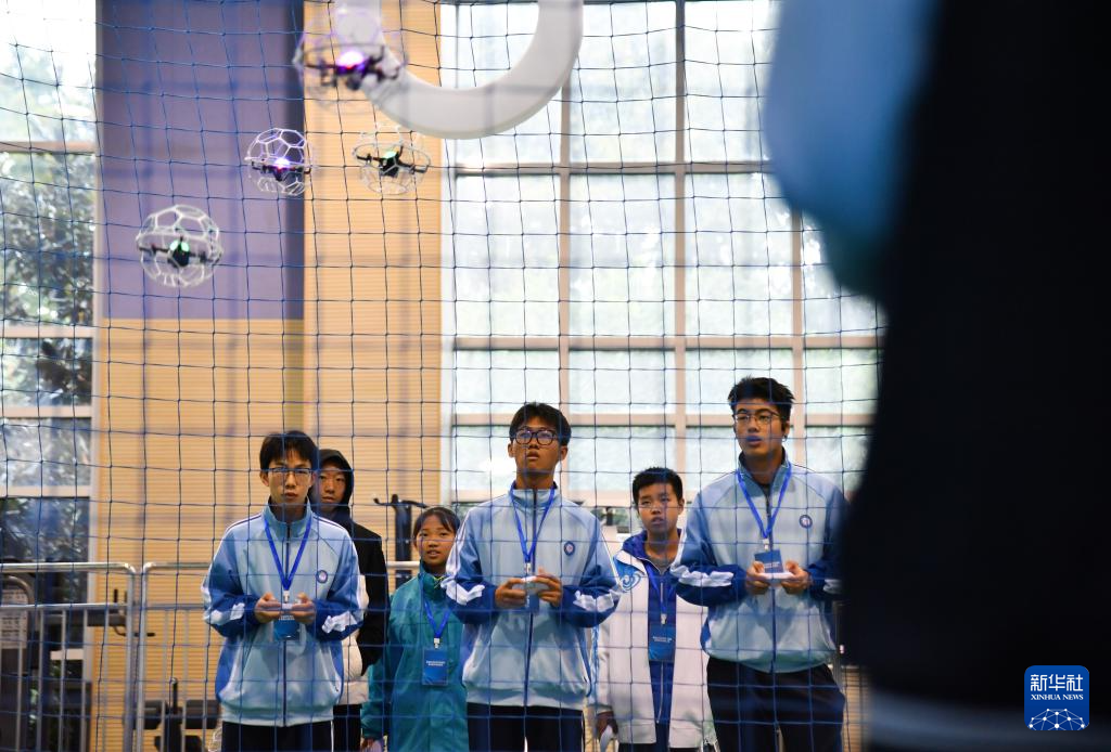 10月26日,学生在西安市新城区太华路小学参加多轴无人机足球对抗赛。