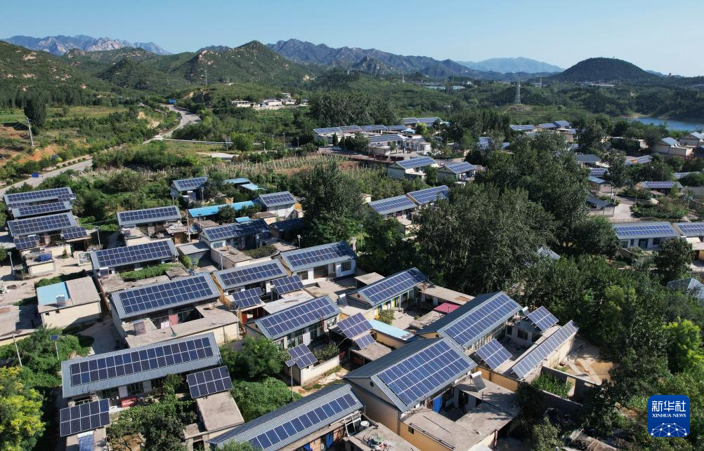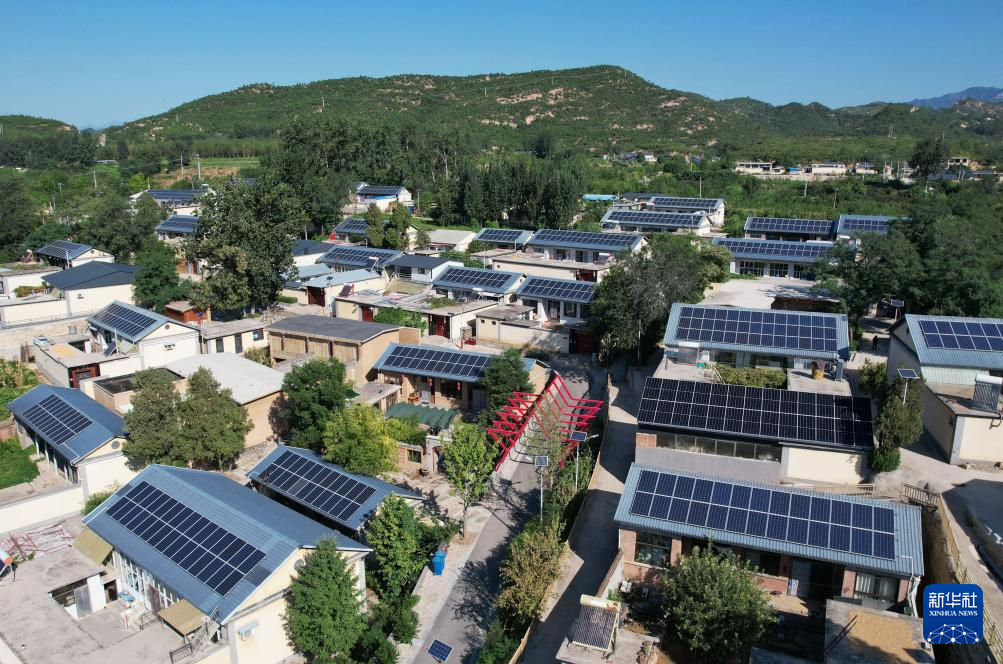 9月12日拍摄的河北省平山县西柏坡镇北庄村兆瓦级“光储”智能微电网示范工程项目中的屋顶光伏发电板(无人机照片)。