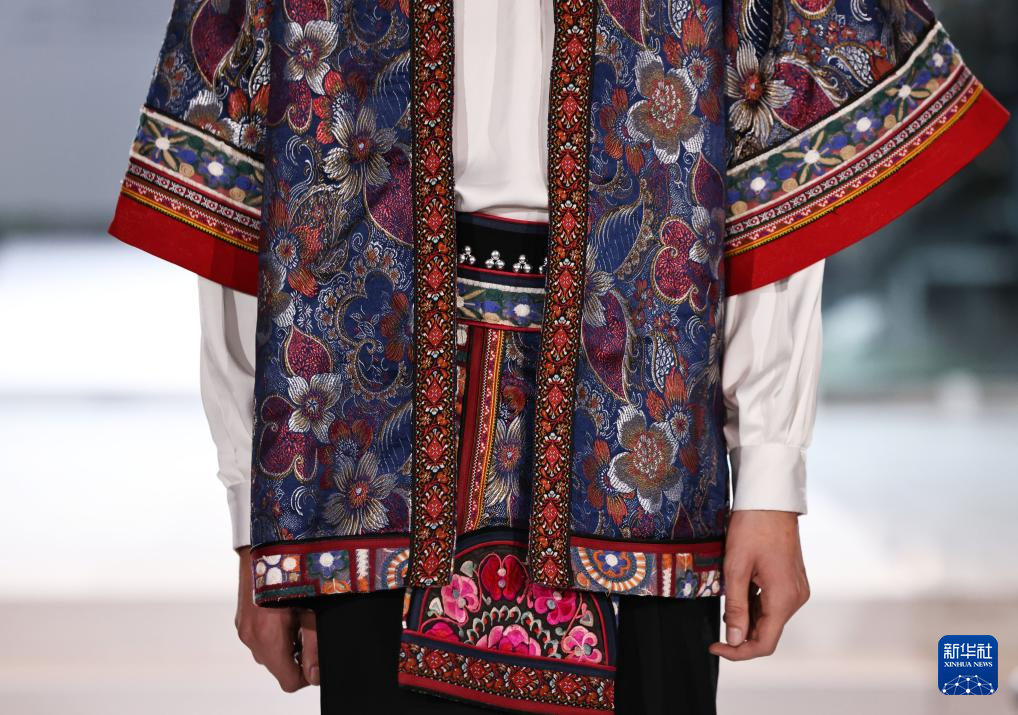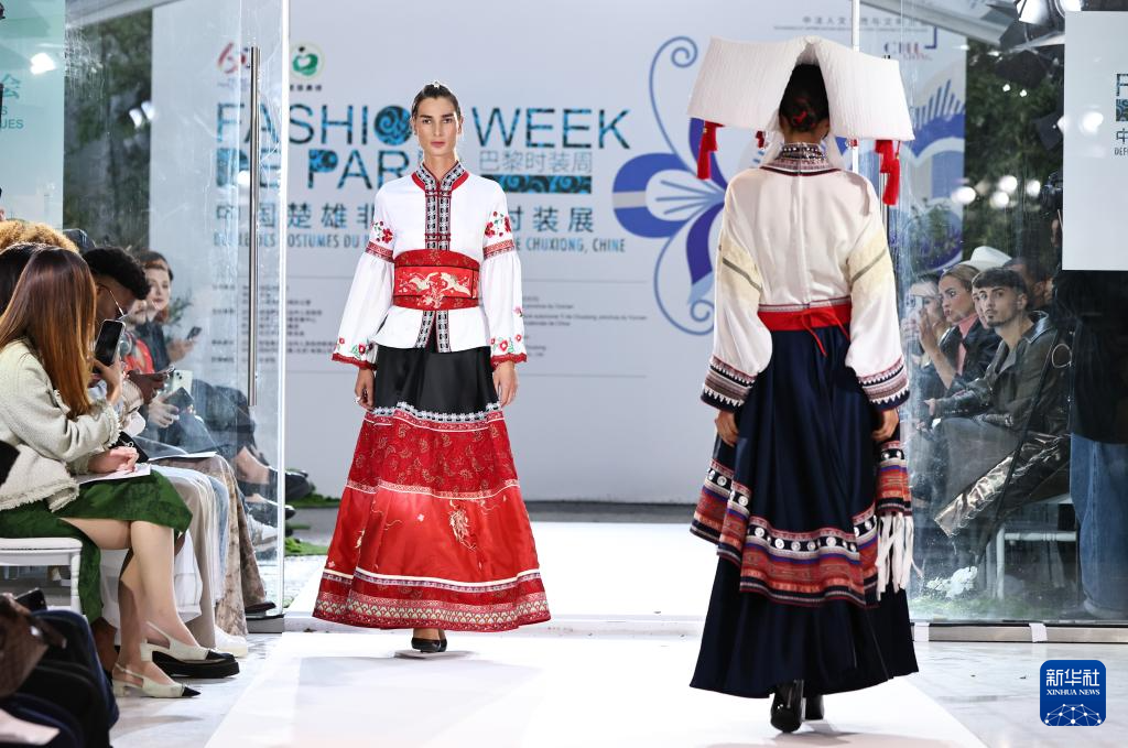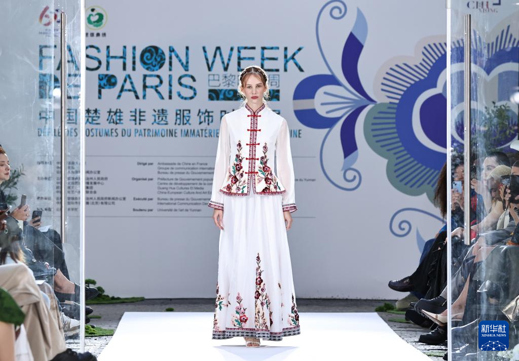 9月26日,模特在法国巴黎举行的中国楚雄非遗服饰时装展上展示时装。