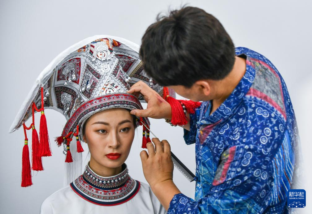 8月27日,在昆明一处摄影棚内,一名穿着参展服饰的模特(左)拍摄定妆照前整理头饰。