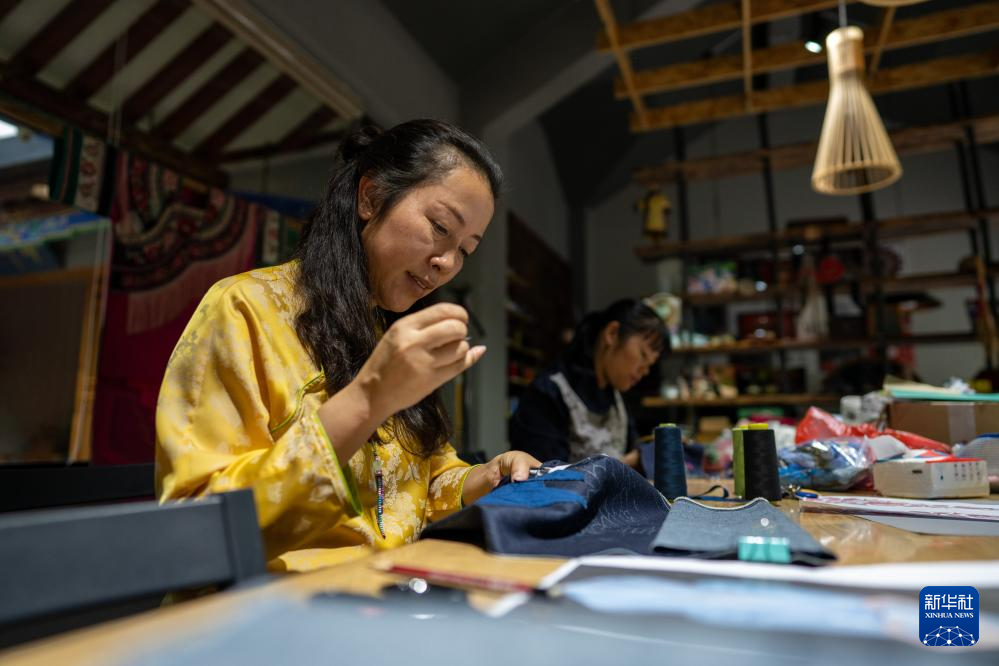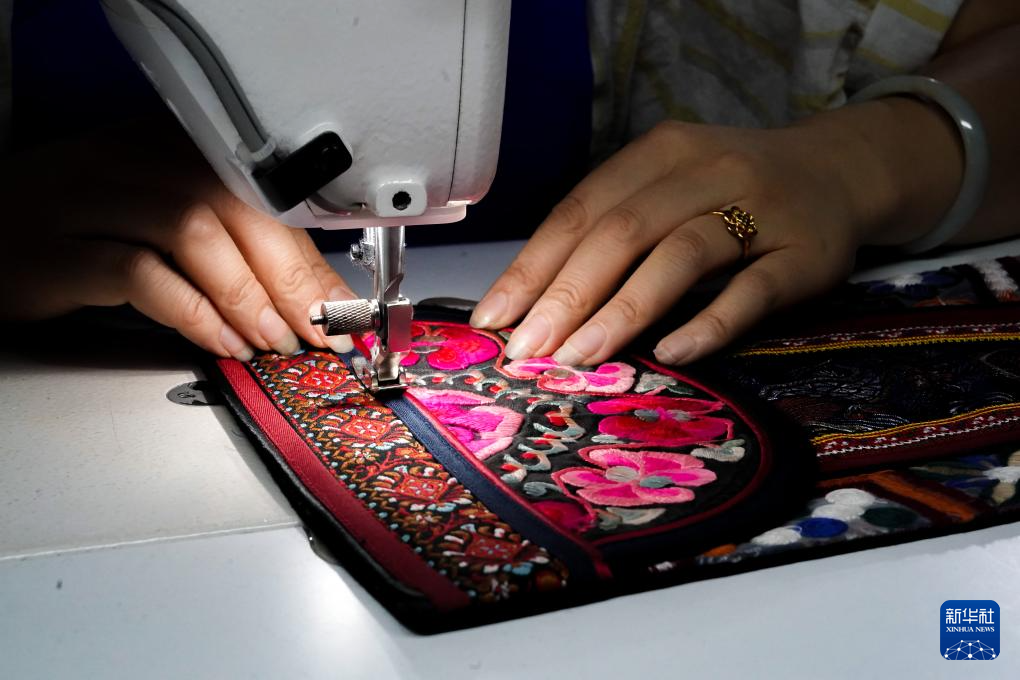 9月7日,国家级非物质文化遗产代表性项目彝族服饰州级代表性传承人卢洁莹在自己云南楚雄的工作室内制作绣品。卢洁莹是赴巴黎参展彝族服饰作品的设计师之一。