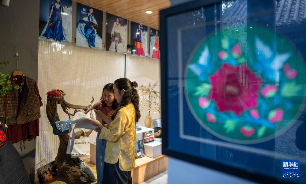 9月7日,国家级非物质文化遗产代表性项目彝族服饰州级代表性传承人卢洁莹(右)在自己云南楚雄的工作室内向访客介绍彝绣服饰。卢洁莹是赴巴黎参展彝族服饰作品的设计师之一。