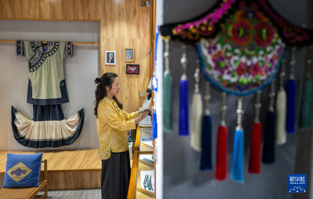 9月7日,国家级非物质文化遗产代表性项目彝族服饰州级代表性传承人卢洁莹在自己云南楚雄的工作室内查看彝绣服饰。卢洁莹是赴巴黎参展彝族服饰作品的设计师之一。