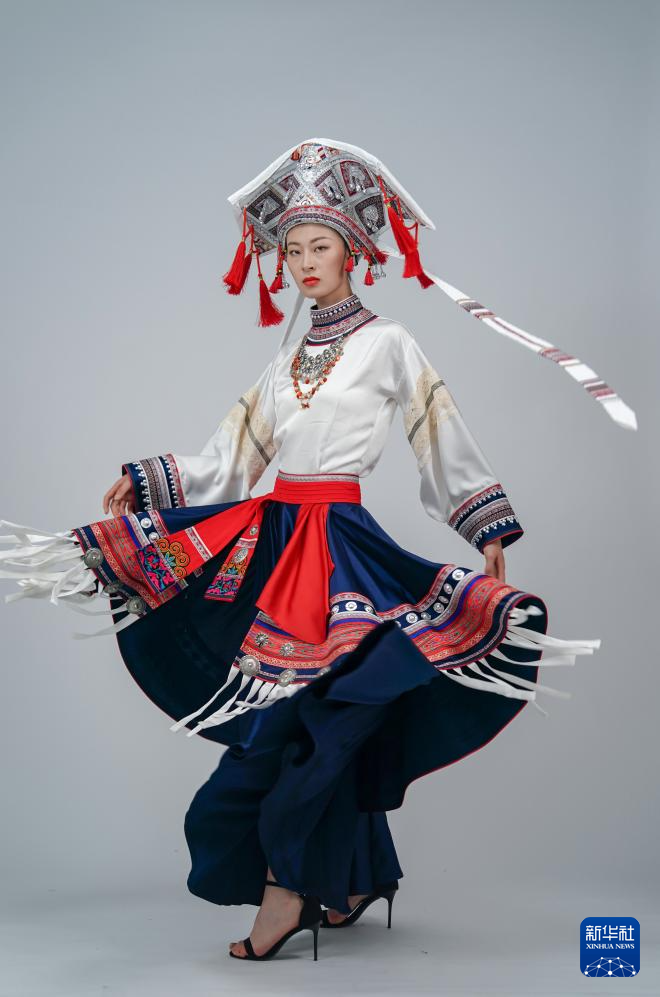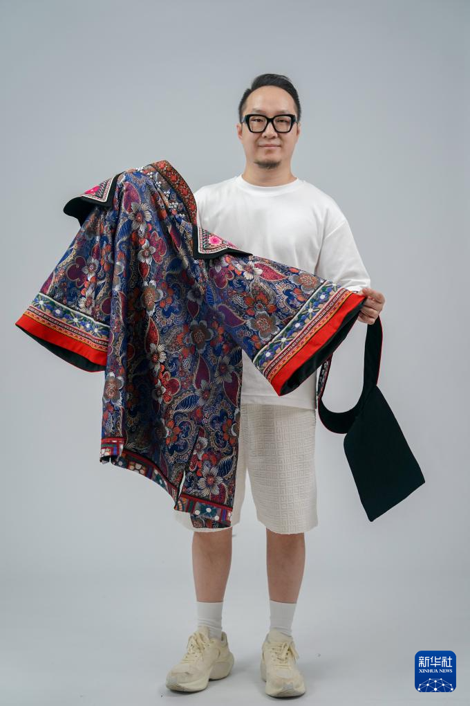 8月27日,在昆明一处摄影棚内,云南艺术学院设计学院服装与服饰设计系教师范佳展示一件将赴巴黎参展的彝绣服装。范佳是参展彝族服饰作品的设计师之一。