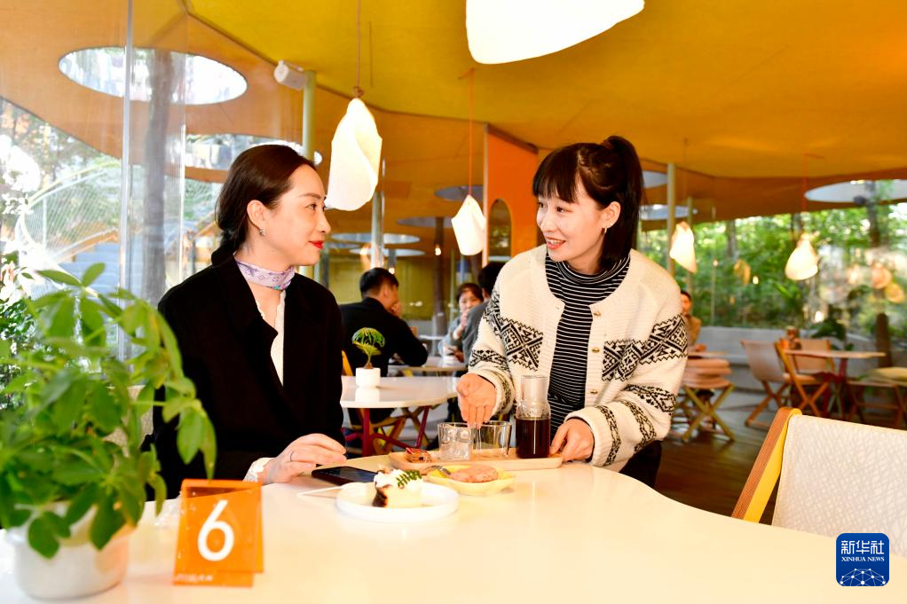 10月23日,在日照市五莲县白鹭湾小镇咖啡与树咖啡厅,咖啡师赵敏为客人端来茶点。赵敏2021年辞去幼师工作,来到白鹭湾小镇,成为一名咖啡师。
