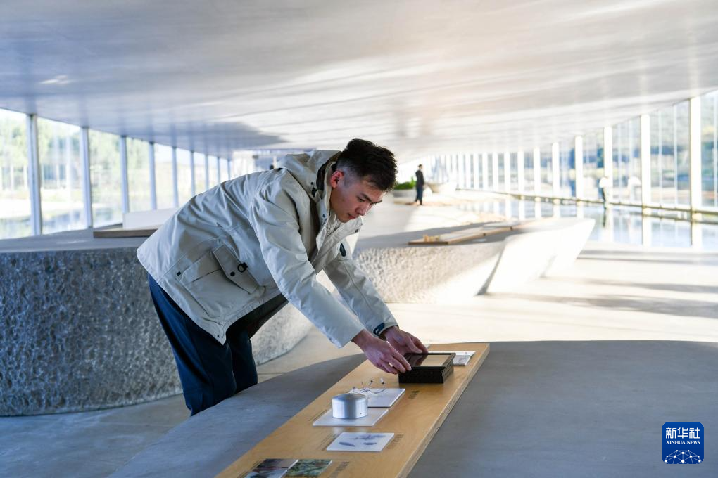 10月23日,在日照市五莲县白鹭湾小镇在水一方美术馆,刘茗轩在整理摆件。2018年,刘茗轩辞去外地工作回到家乡,在白鹭湾小镇从事文旅景区运营工作。
