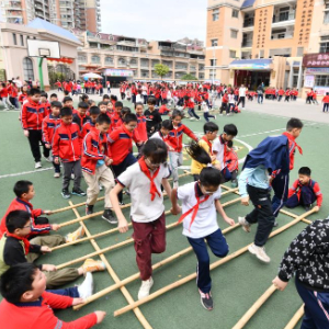 在梧州市平浪希望小学,学生们在体育大课间跳竹竿舞(10月25日摄)。