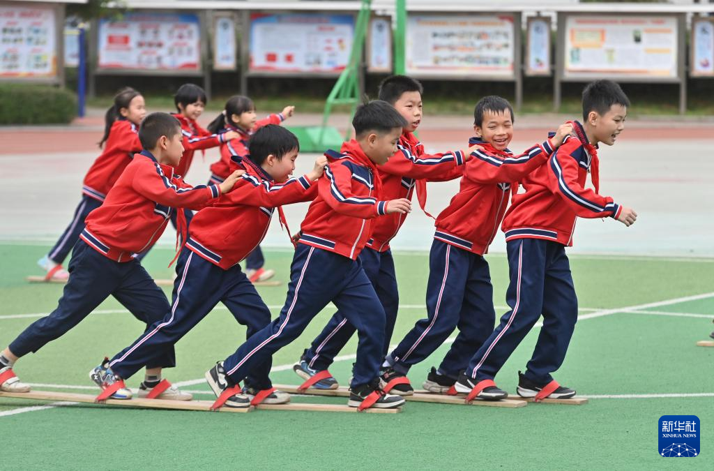 在梧州市龙平小学,学生们在体育大课间进行板鞋竞速练习(3月26日摄)。
