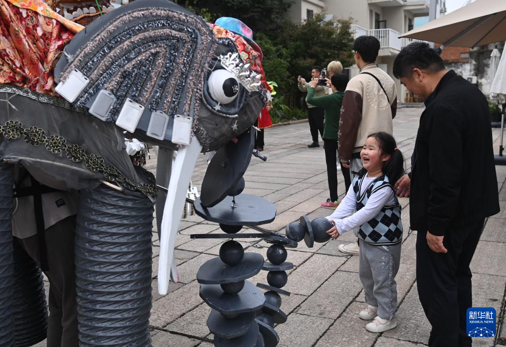 10月27日,小朋友在南浔古镇街头与巡游“大象”互动。