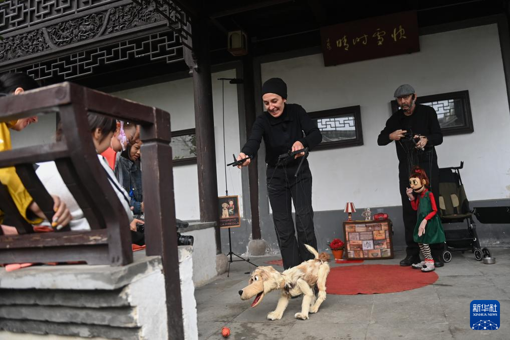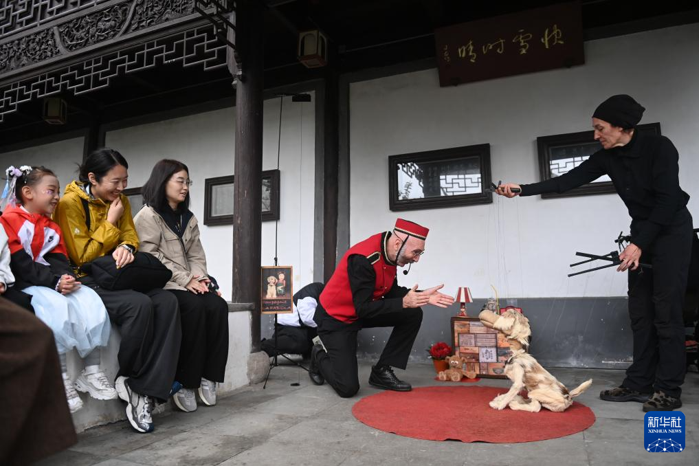 10月27日,来自意大利的艺术表演者在南浔古镇宜园为游客表演轻喜偶剧。