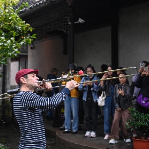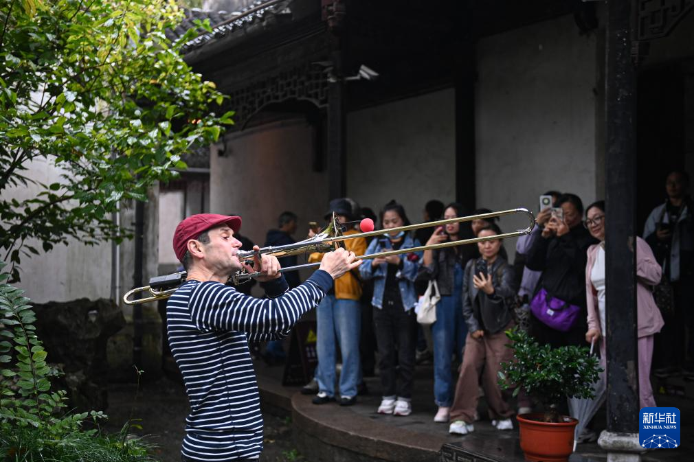 10月27日,来自瑞典的艺术表演者在南浔古镇小莲庄为游客演绎互动音乐会。