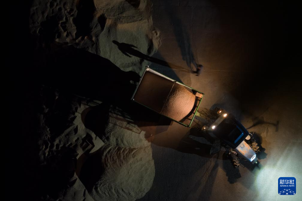 夜晚的晒场中,一车车收获的“丰果”源源不绝,装卸车的头灯划破了夜的宁静。沉甸甸的稻谷堆积成山,阵阵清香之间,希望在积蓄、酝酿、升腾。