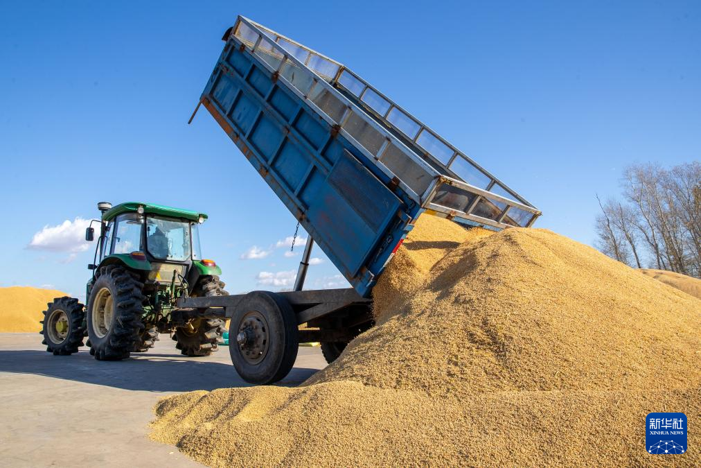 10月12日,北大荒集团梧桐河农场有限公司晒场,种植户在进行卸车作业。