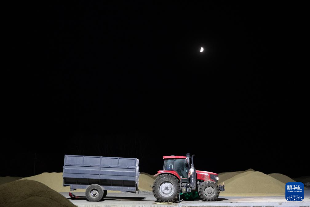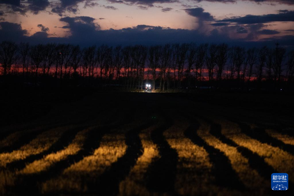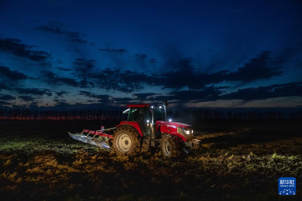 夜晚的稻田里,一边是收获,一边是整地。大马力联合整地机在已收获完的稻田中作业,收翻结合,秸秆还田,养足黑土地的地力,为来年耕耘带来活力。