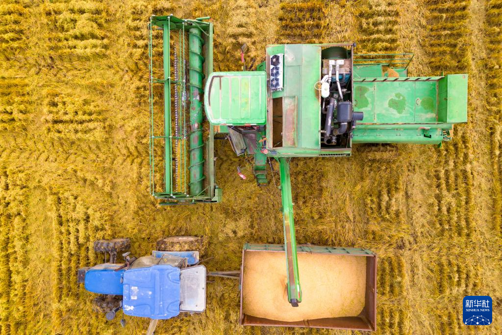 10月11日,北大荒集团普阳农场有限公司作业区,种植户驾驶农机卸下刚刚收割的水稻(无人机照片)。