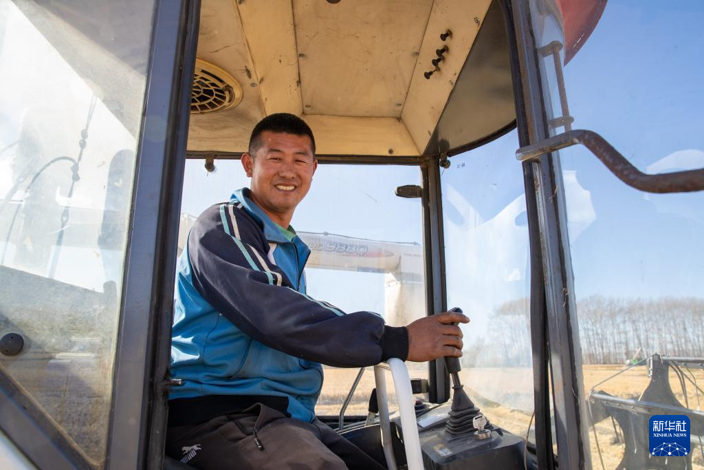 10月12日,北大荒集团普阳农场有限公司作业区,种植户冷立春在农机上。