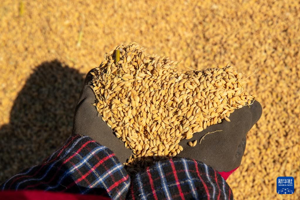 10月12日,北大荒集团梧桐河农场有限公司晒场,种植户展示刚刚收获的稻谷。