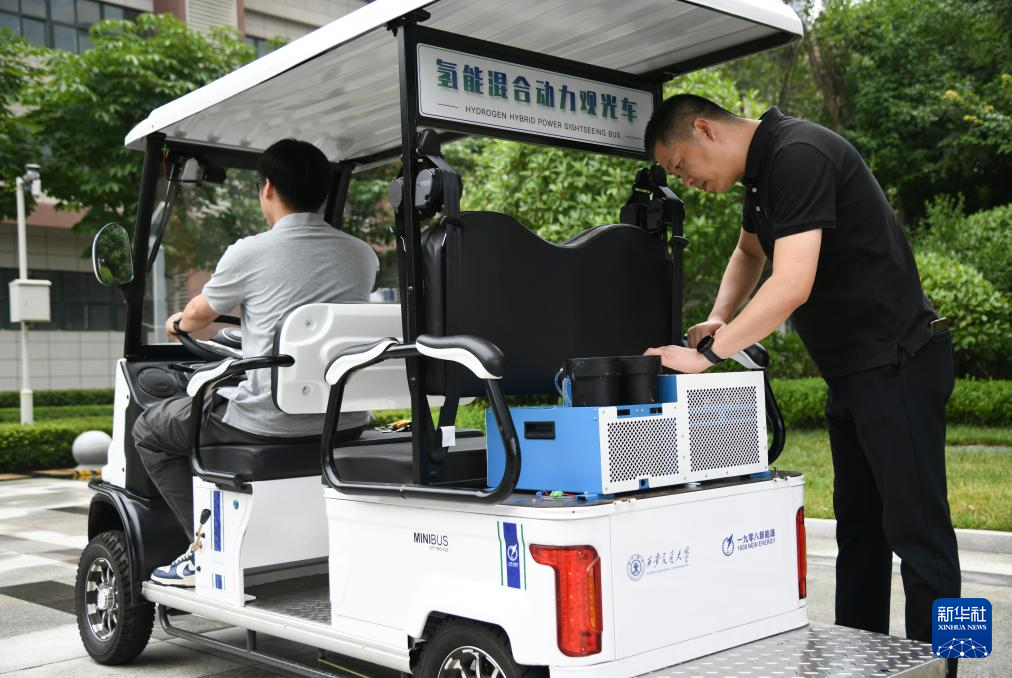 7月10日,西安一九零八新能源科技有限公司工作人员调试一款氢能混合动力观光车。